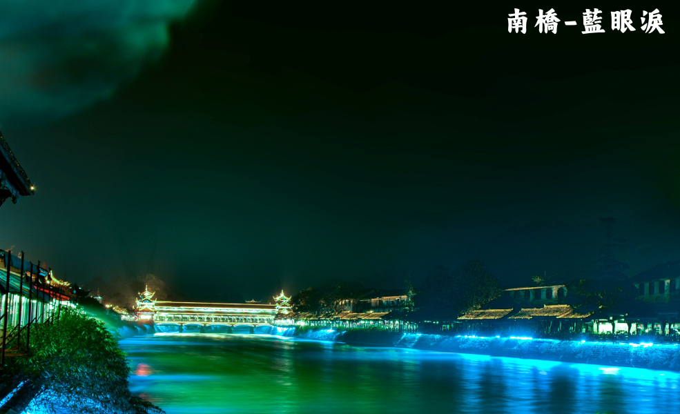 【灌縣古城】這座與都江堰水利工程緊密相連的千年古城,自古便是川西門戶與茶馬古道的重鎮。城內建築保留了濃郁的川西民居風格,飛簷翹角與青石板路交織出深厚的歷史韻味。您可以漫步在古色古香的街道,探尋楊柳坪、幸福徑等歷史街區,感受繁華卻不失寧靜的市井煙火。入夜後,整座古城被燈火點亮,特別是橫跨岷江的「南橋」,其壯麗的飛簷與燈光投射在江面上,幻化成神祕夢幻的螢光藍色,形成近年最火紅的「藍眼淚」瀑布景觀。這是一處融合古建築美學與現代網紅奇蹟的必訪勝地,展現了都江堰獨有的浪漫風情。